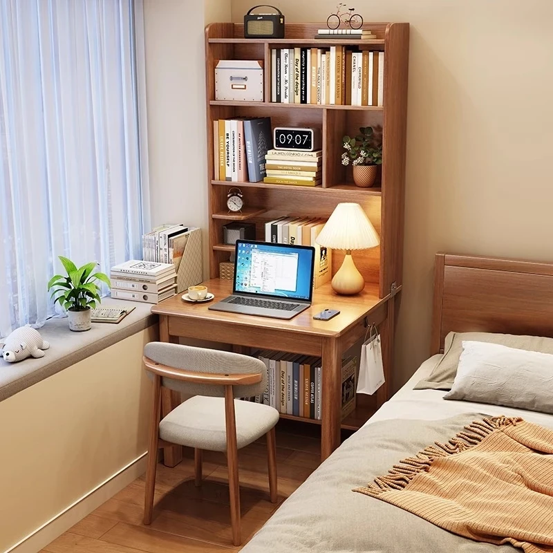 Nordic Solid Wood Desk and Bookshelf Combo - Compact Study Table for Students and Home Use, Perfect for Small Spaces and Bedroom Wall Placement