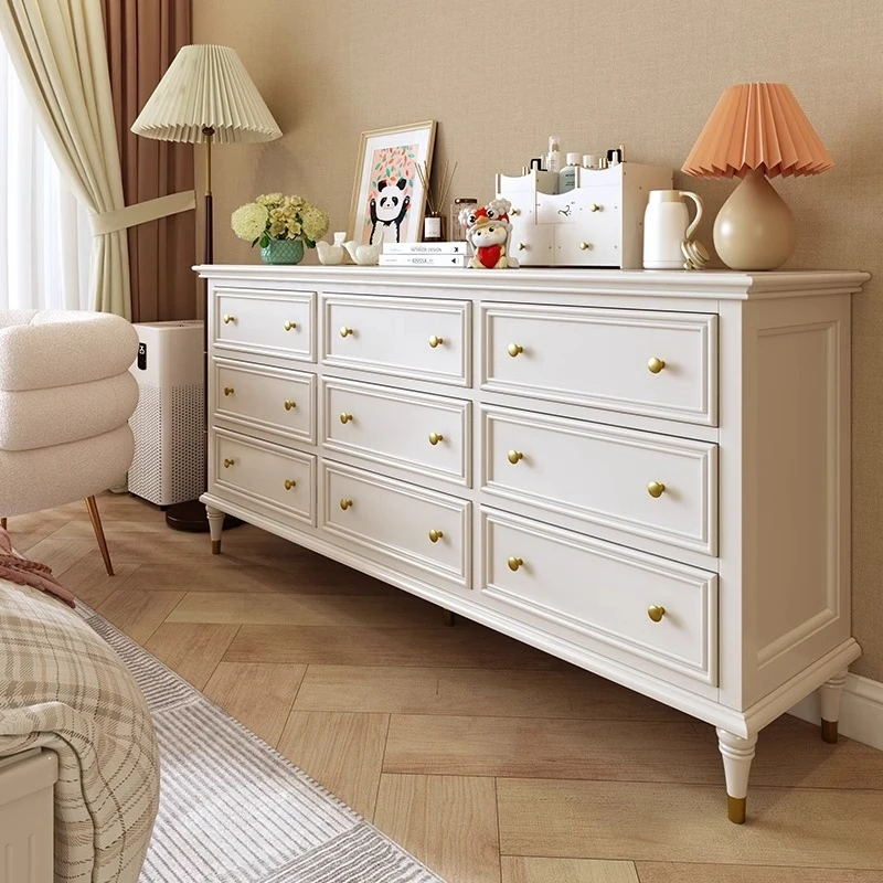 Elegant French-Style Solid Wood Dresser - White Wall-Mounted Cabinet for Bedroom Storage, Chic American Design for Easy Access, Perfect for Tailored Comfort and Stylish Decor.