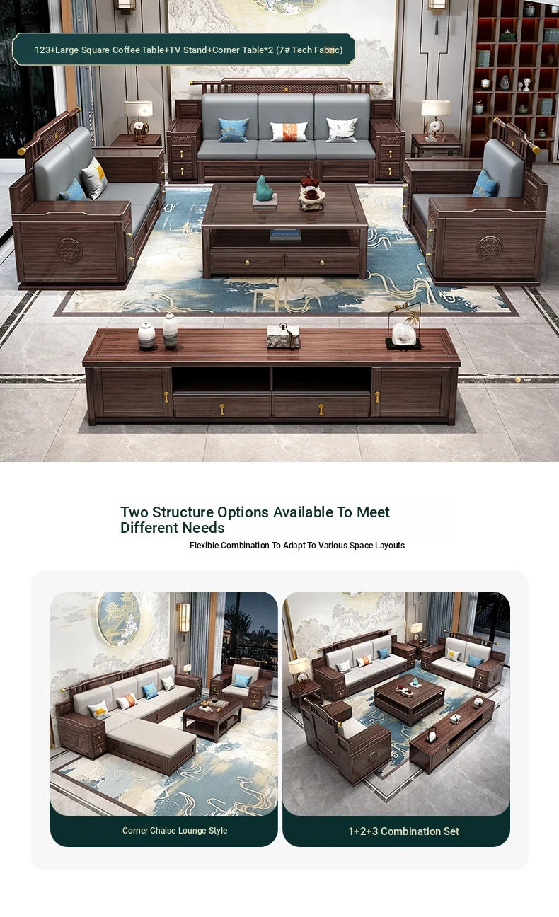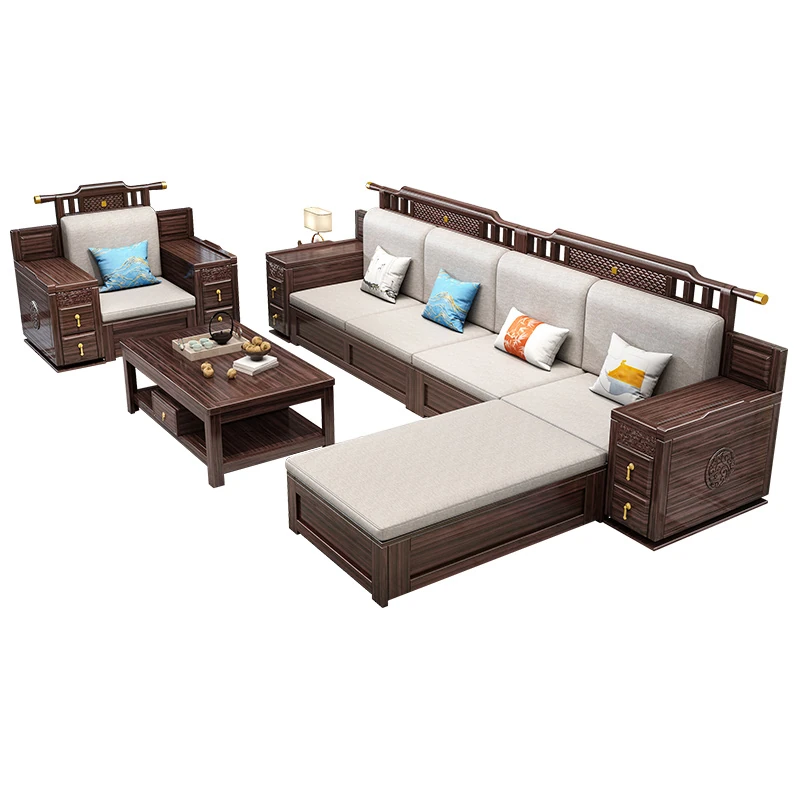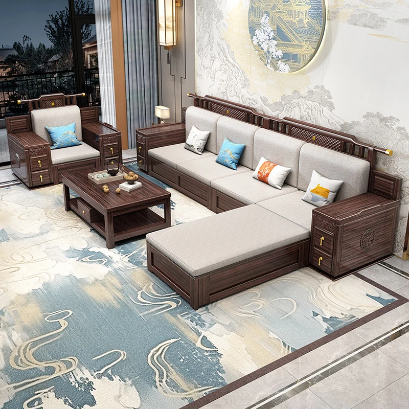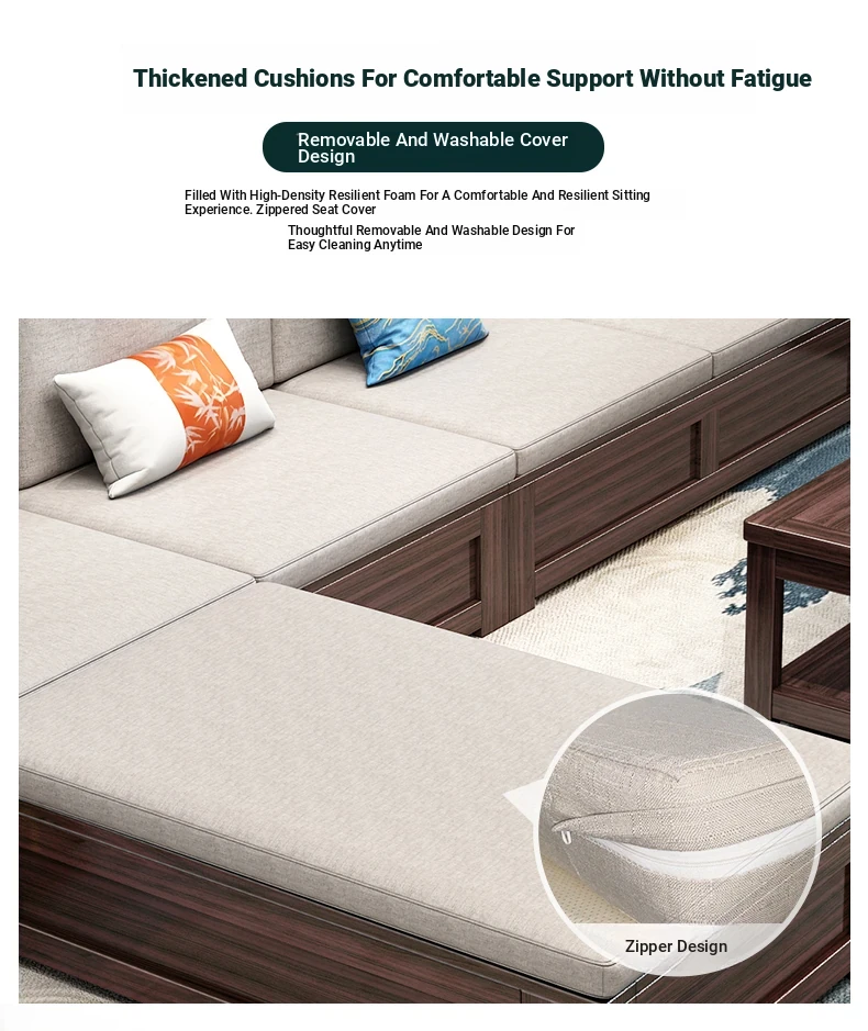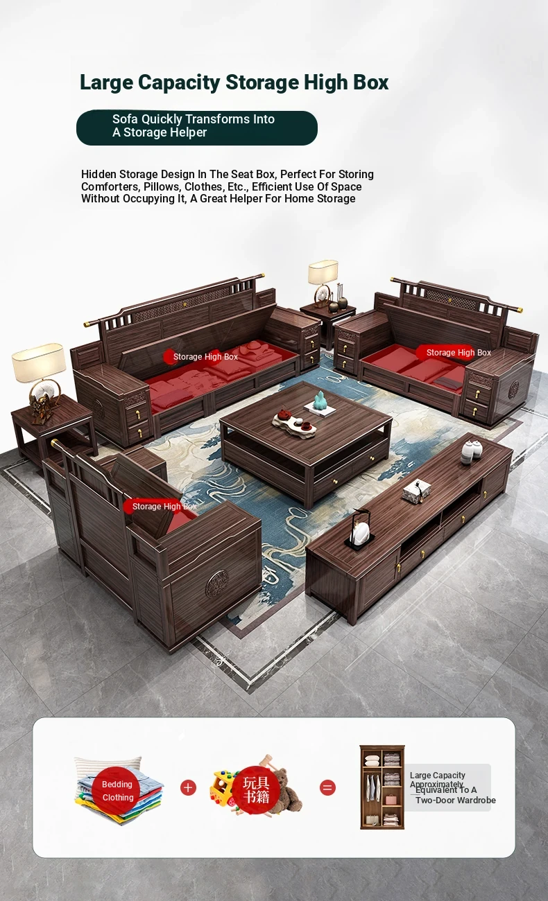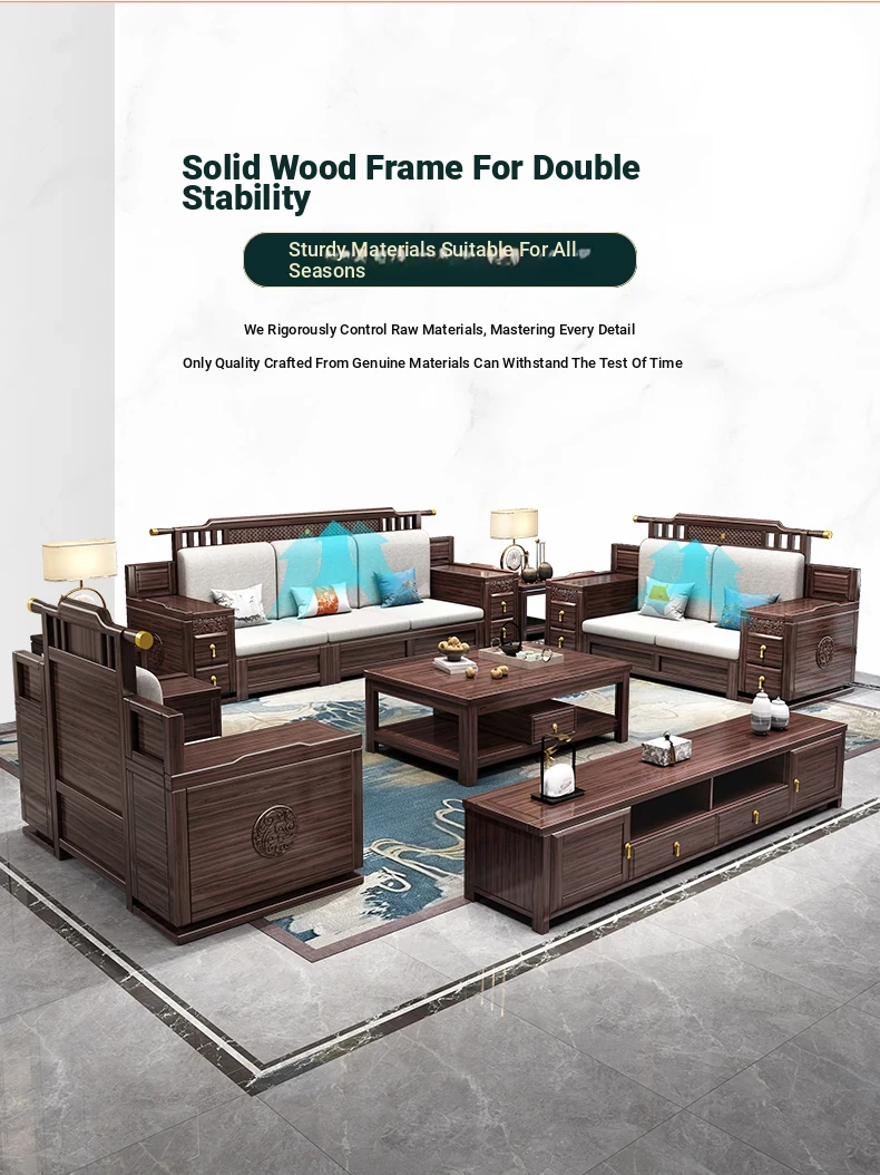 Introducing the Wopai New Chinese Style Solid Wood Sofa Set: A Modern Minimalist Design in Elegant Dark Hardwood. Ideal for Year-Round Comfort, This Versatile Living Room Furniture Features Ample Storage Solutions. Perfect for Contemporary Homes!
