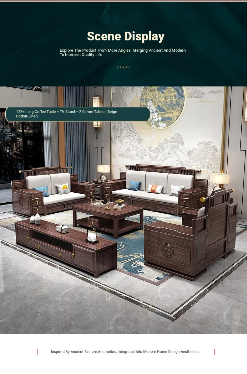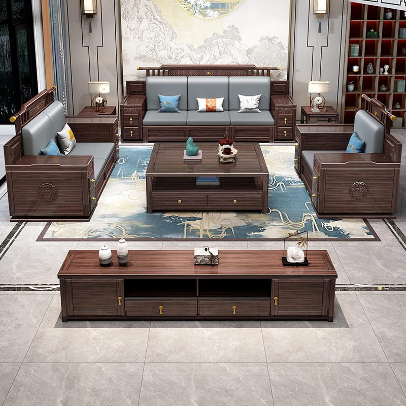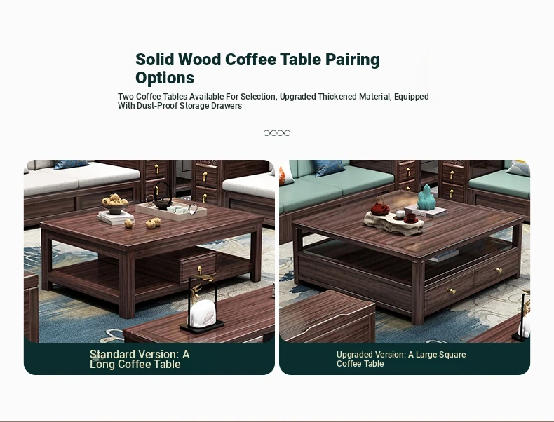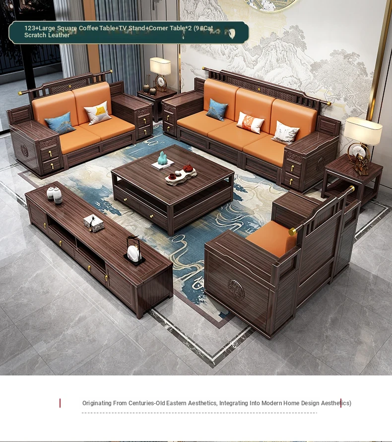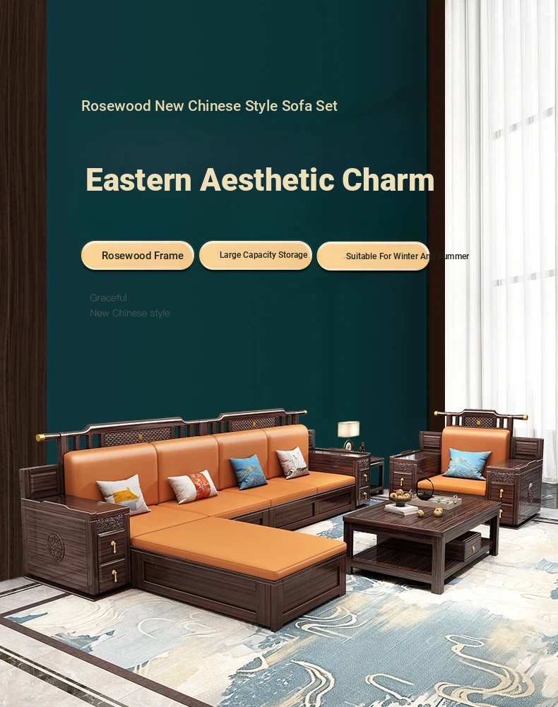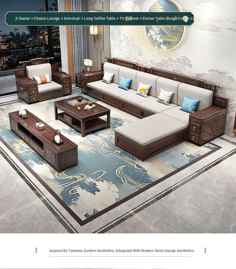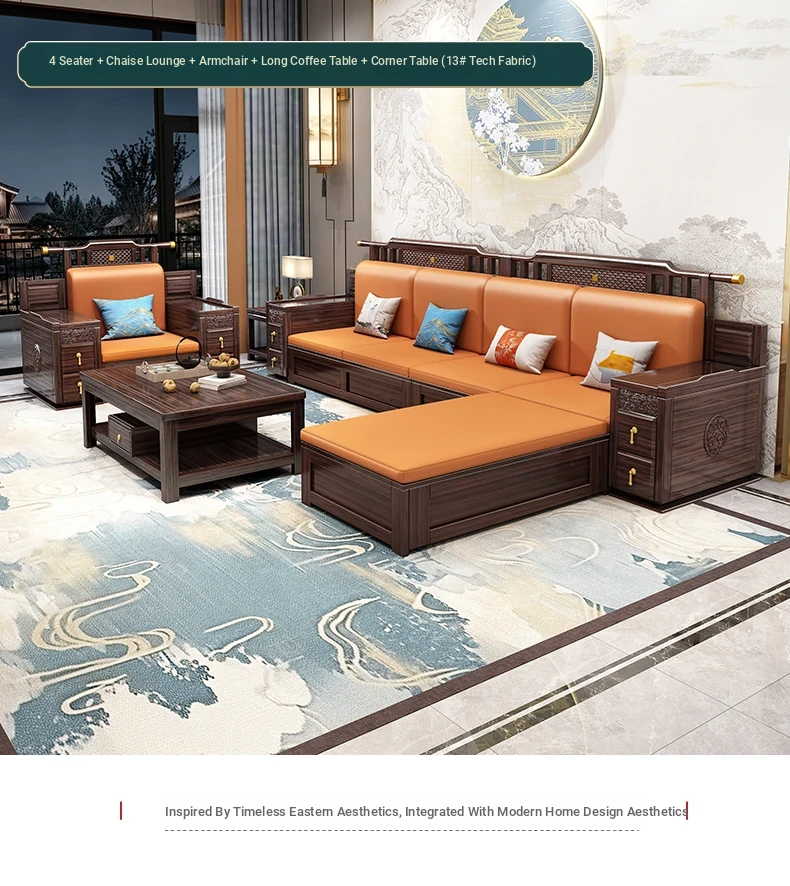 Introducing the Wopai New Chinese Style Solid Wood Sofa Set: A Modern Minimalist Design in Elegant Dark Hardwood. Ideal for Year-Round Comfort, This Versatile Living Room Furniture Features Ample Storage Solutions. Perfect for Contemporary Homes!